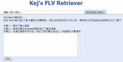 第2步 再到網站 http://kej.tw/flvretriever/ ,把剛剛複製的網址貼在欄位內,再按一下[RETRIEVE NOW !]按鈕
